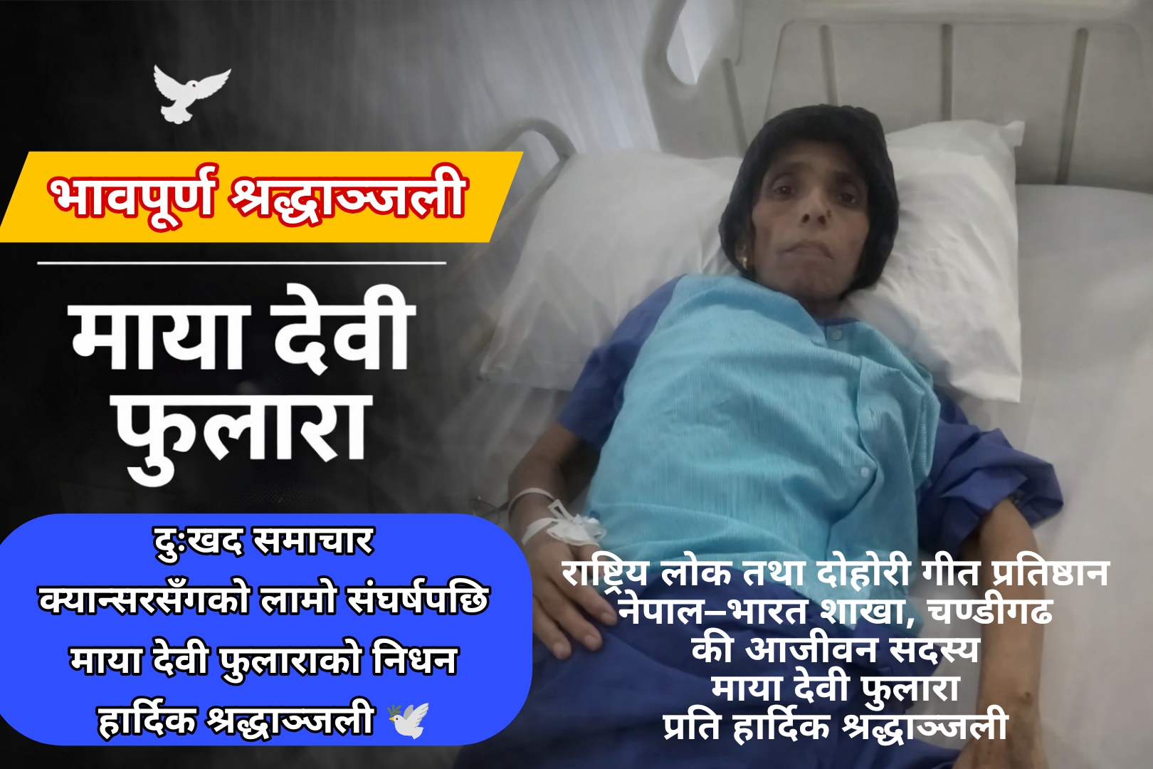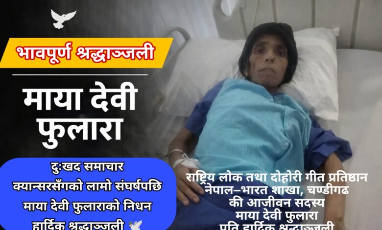 राष्ट्रिय लोक तथा दोहोरी गीत प्रतिष्ठान नेपाल–भारत शाखा, चण्डीगढकी आजीवन सदस्य माया देवी फुलारा ज्यूको क्यान्सर जस्तो घातक रोगसँग लामो समयदेखि संघर्ष गर्दै आउँदा दुःखद निधन भएको छ। उहाँ सन् २०१५ देखि क्यान्सर रोगसँग जुधिरहनुभएको थियो। उपचारका क्रममा उहाँ भारतस्थित Max Hospital Delhi मा उपचाररत रहनुभएको थियो। चिकित्सकको सल्लाहअनुसार केही समयअघि नेपाल फर्किनु भएको थियो। तर स्वास्थ्य अवस्था जटिल बन्दै जाँदा अन्ततः उहाँले यस संसारलाई विदा गर्नुभएको हो।उहाँको निधनले परिवार, आफन्त, शुभचिन्तक तथा लोकदोहोरी क्षेत्रलाई अपूरणीय क्षति पुगेको छ। उहाँ संस्थाप्रति समर्पित, सरल र सहयोगी स्वभावकी व्यक्तित्वका रूपमा परिचित हुनुहुन्थ्यो।संस्थाको पहलमा सहयोग संकलन